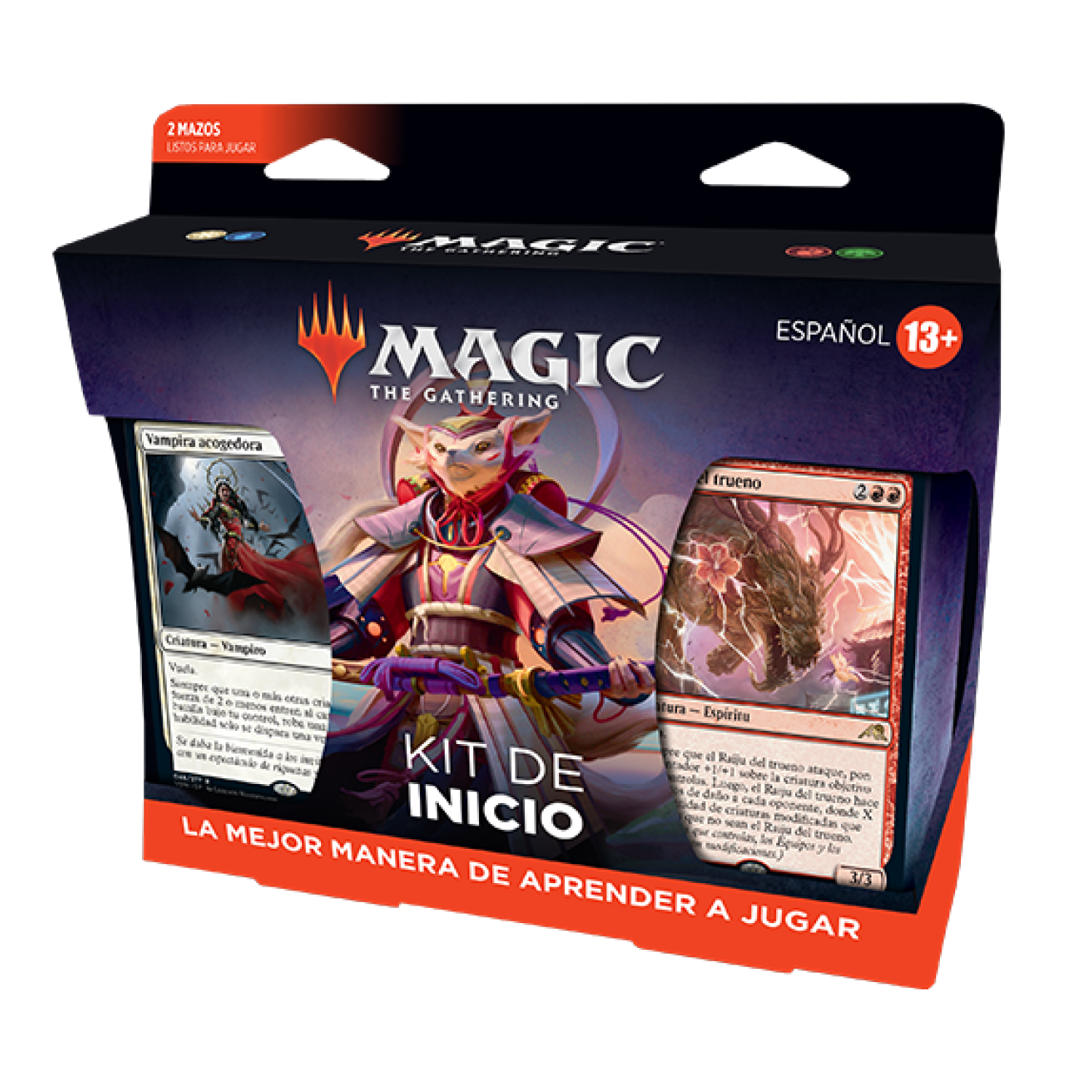 El Kit de inicio 2022 de Magic: The Gathering contiene todo lo que dos jugadores necesitan para empezar a jugar, tanto en persona como en línea. Incluye dos mazos listos para jugar, uno blanco-azul y otro rojo-verde, cada uno con cinco cartas raras (incluyendo una foil), además de códigos para desbloquearlos en MTG Arena, un tutorial digital interactivo y un folleto con las reglas para aprender los fundamentos del juego.