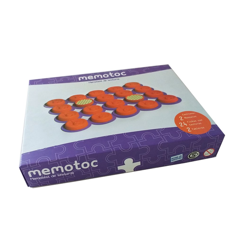 Memotest Táctil es un juego diseñado para ejercitar la memoria a través del tacto. Cuenta con 12 pares de fichas con distintas texturas de aproximadamente 4 cm de diámetro, dos tableros de juego, un manual impreso y un manual traducido al braille, ofreciendo una experiencia inclusiva para jugadores con discapacidad visual.