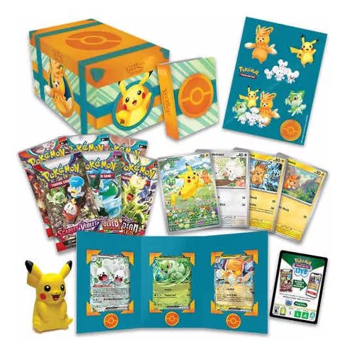 | Componentes | – 7 tarjetas promocionales de aluminio con Pikachu, Sprigatito ex, Pawmi, Pawmo, Pawmot ex, Tandemaus y Maushold ex – 1 hoja de pegatinas tecnológicas – 1 mini cartera – 1 juguete blando Pikachu – 6 paquetes de refuerzo Pokémon TCG – Cada paquete de refuerzo contiene 10 tarjetas y 1 Energy básica o 1 marcador VSTAR. Las tarjetas varían según el paquete. – Una tarjeta de código para Pokémon TCG Live. |